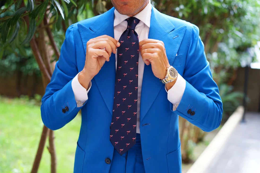 This Navy Blue Pink Flamingo Necktie is a knock-out. Crafted by hand and designed in Melbourne, it has been cut for a sharp, neat fit and finished with a handsome Prince of Wales navy blue backing to add a stylish point of difference. Flamingos often stand on one leg, the other leg tucked beneath the body. The reason for this behaviour is not fully understood. Inspired by the bird who no one ever understood, we bring you the Navy Blue Pink Flamingo Necktie.