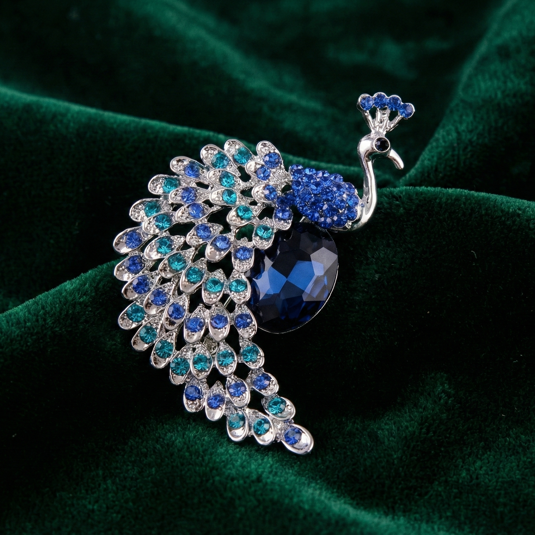 A show-stopping statement, the Diadem Peacock Brooch dazzles with layers of aquamarine, cobalt, and sapphire blue stones that recreate the splendour of peacock feathers. A faceted navy gem sits at the base of the plumage, adding depth and dimension. Finished with silver detailing and a poised headpiece, this brooch turns any lapel or sash into a regal canvas.