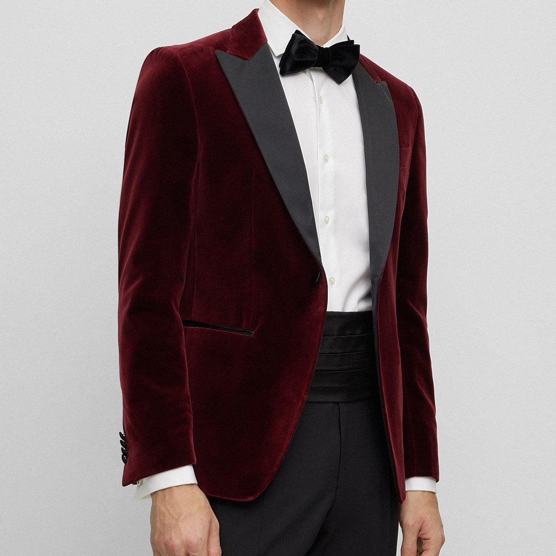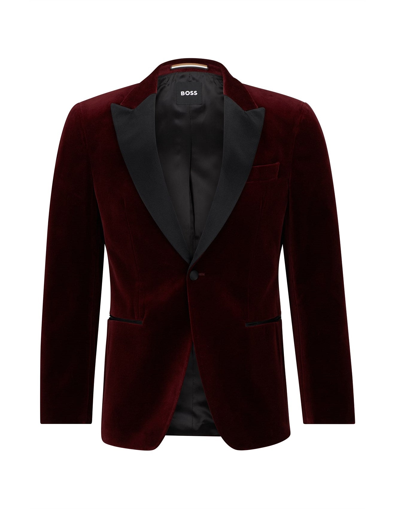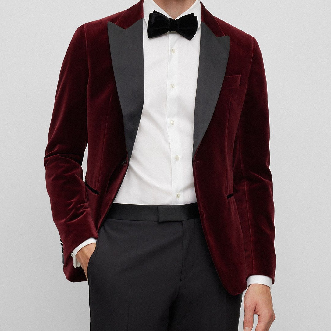 Elegance personified in this luxurious Hugo Boss Crimson Ruby Velvet Dinner Jacket. Crafted in beautiful cotton jacquard, with a swirl motif and branded typeface lining inside. Perfect for that gent wanting to make a luxurious statement at his next black tie or lounge event. Style it up with a tuxedo shirt and bow tie or turtle neck as pictured - the opportunity is endless.